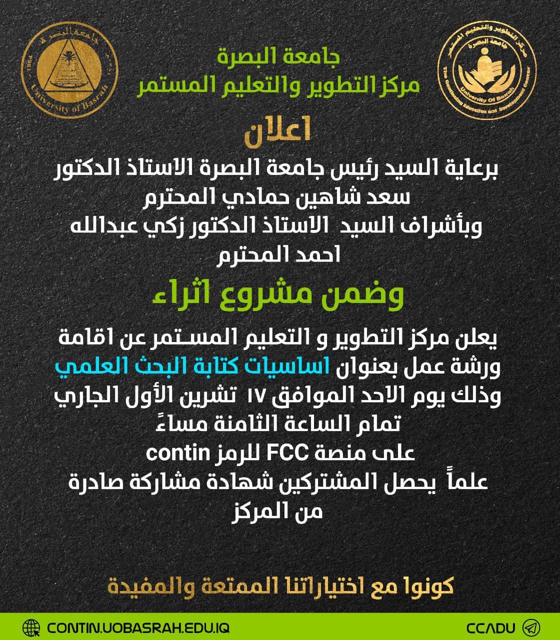 يعلن مركز التطوير و التعليم المستمر عن اقامة ورشة عمل بعنوان اساسيات كتابة البحث العلمي