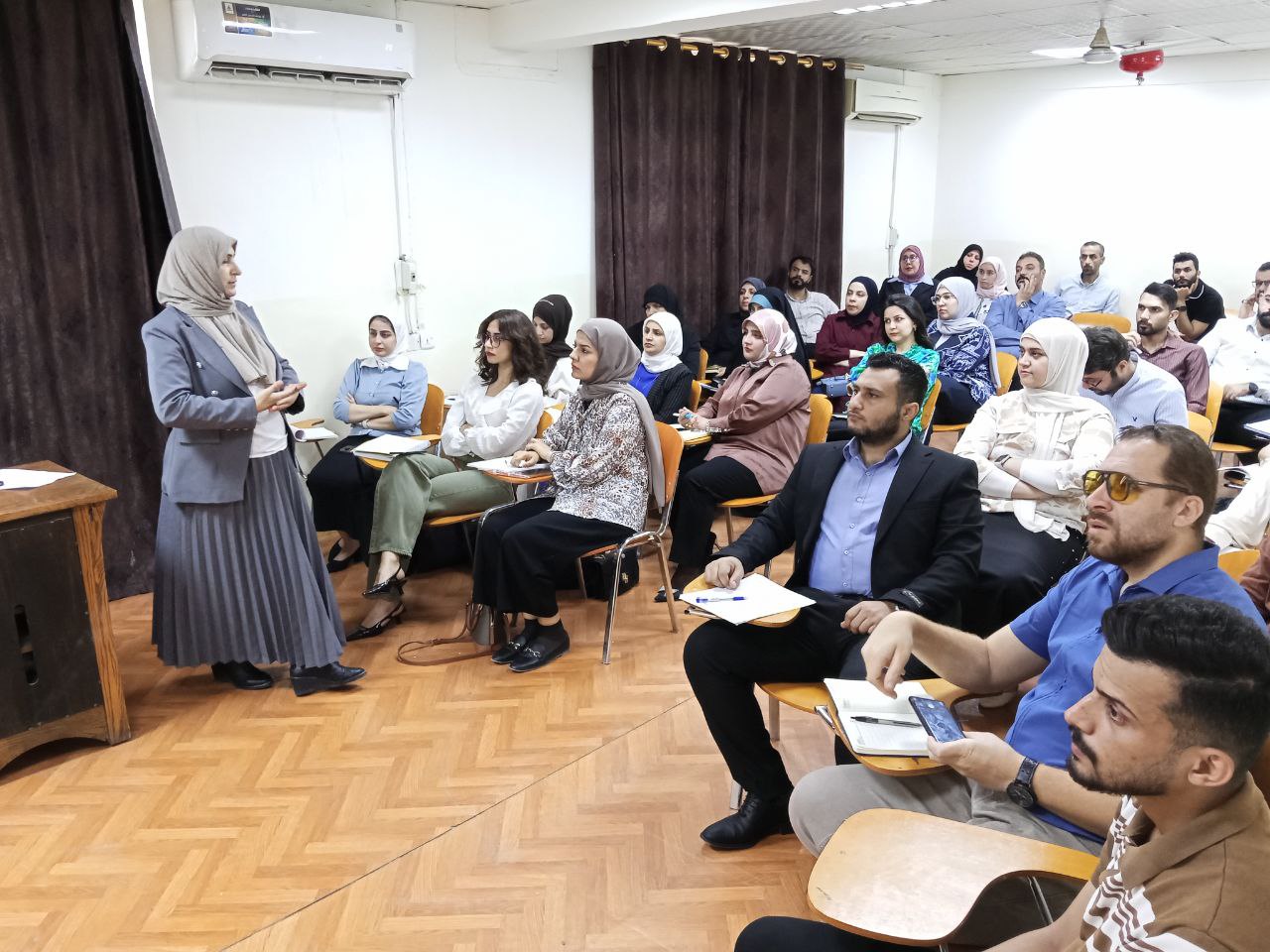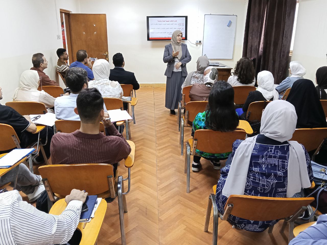 وتضمنت المحاضرة التي قدمتها الدكتورة نهى هادي جاسم ، انواع التقويم والفرق بين القياس والتقويم والفرق بين التقويم والقياس وأهم الأساليب والأدوات المستخدمة في عملية التقويم و مراحل تصميم الاختبارات.