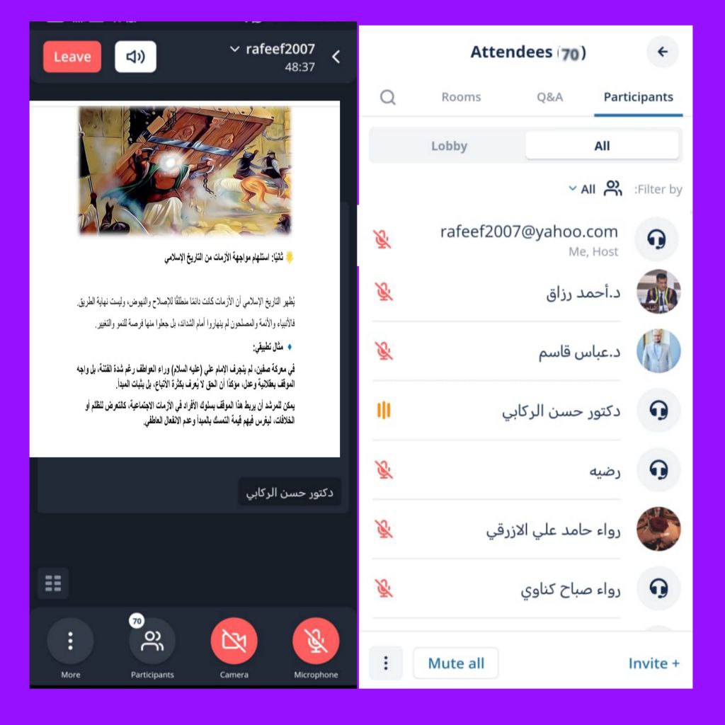 وتضمنت الورشة التي قدمها كلٌّ من الدكتورة رفيف عبدالحافظ الرياحي والدكتور حسن صاحب الركابي، مستعرضين نماذج تاريخية ملهمة مثل الإمام علي والإمام الحسين عليهما السلام، والأم تريزا، وابن سينا، بوصفها رموزاً في الحكمة والصبر والإرشاد الإنساني.