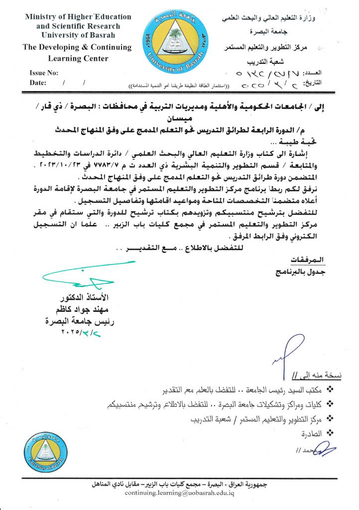 العدد 7/27/5132 في 2/3/2025 يعنون الى جامعة البصرة / مركز التطوير والتعليمالمستمر.