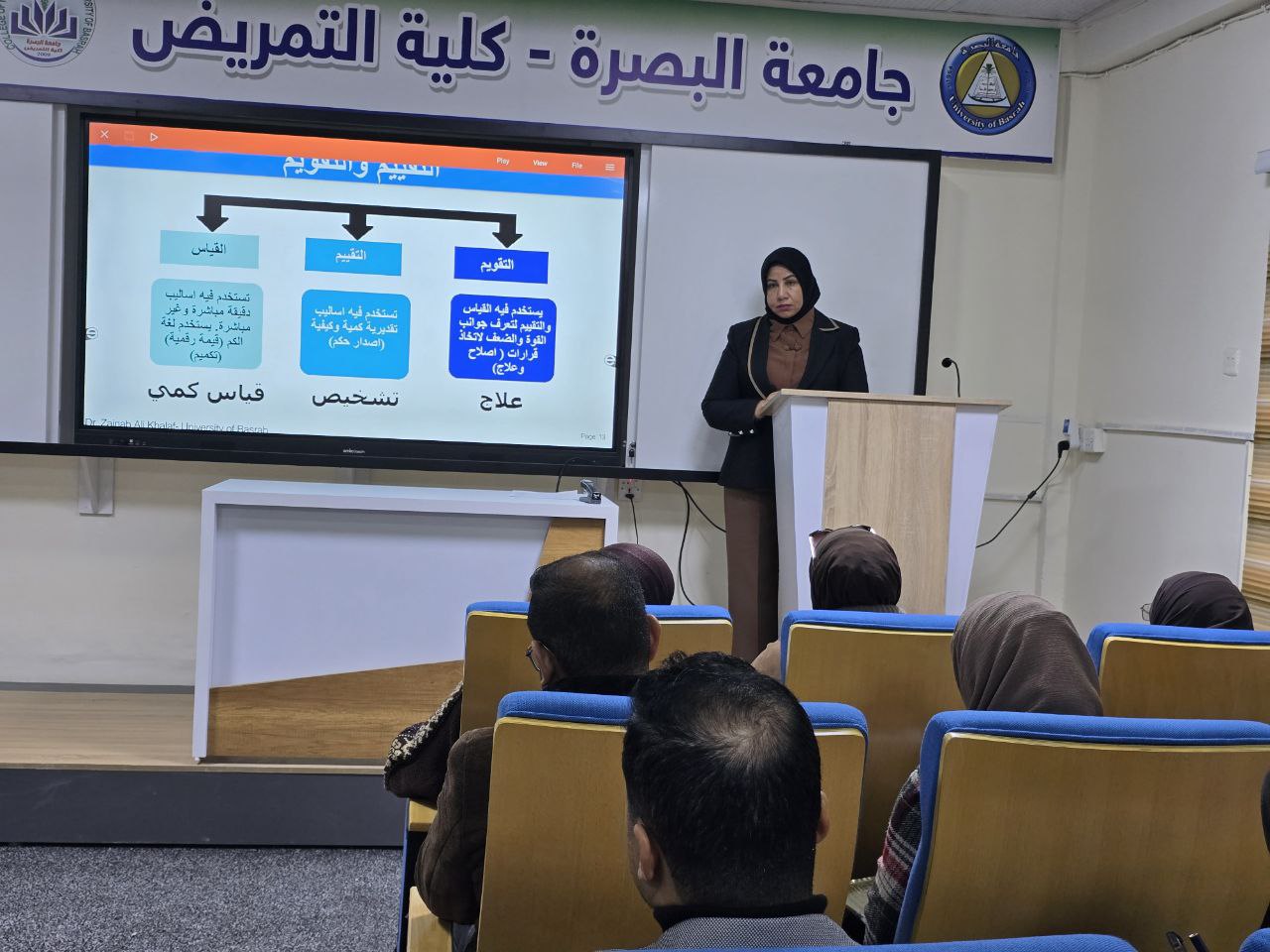نظم مركز التطوير و التعليم المستمر في جامعة البصرة محاضرة ضمن دورة طرائق التدريس السادسة للتخصص التطبيقي، بعنوان (القياس والتقييم والتقويم – الوحدة الثالثة).