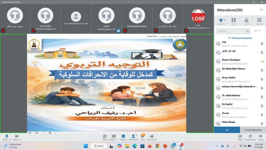نظم مركز التطوير والتعليم المستمر في جامعة البصرة، وبالتعاون مع كلية التربية للبنات، ورشة إلكترونية بعنوان “الإرشاد التربوي كمدخل للوقاية من الانحرافات السلوكية”.