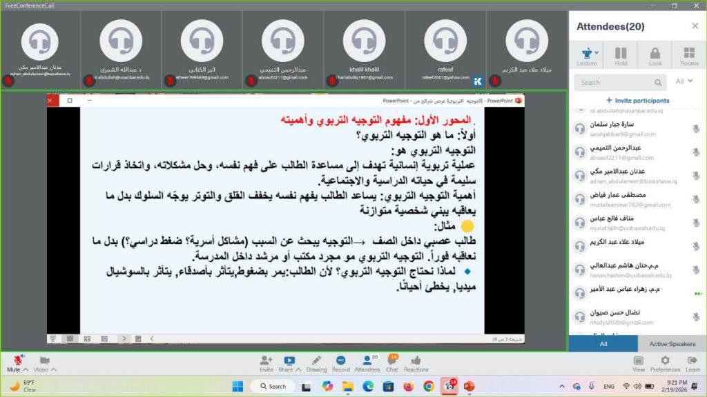 أقام مركز التطوير والتعليم المستمر في جامعة البصرة، بالتعاون مع كلية التربية للبنات، ورشة إلكترونية عن فن التحدث والإقناع في الجلسة الإرشادية من منظور اللغة العربية.