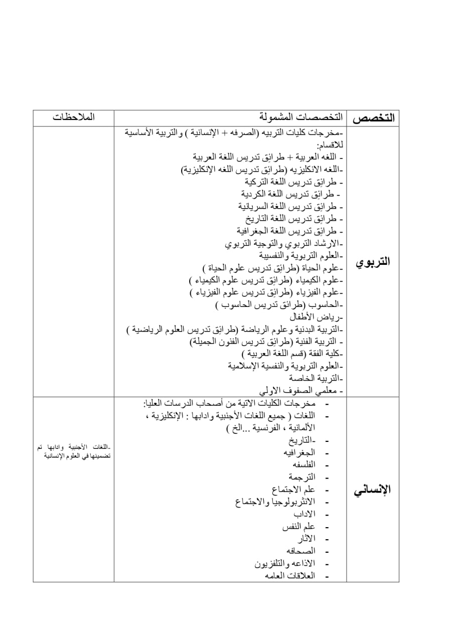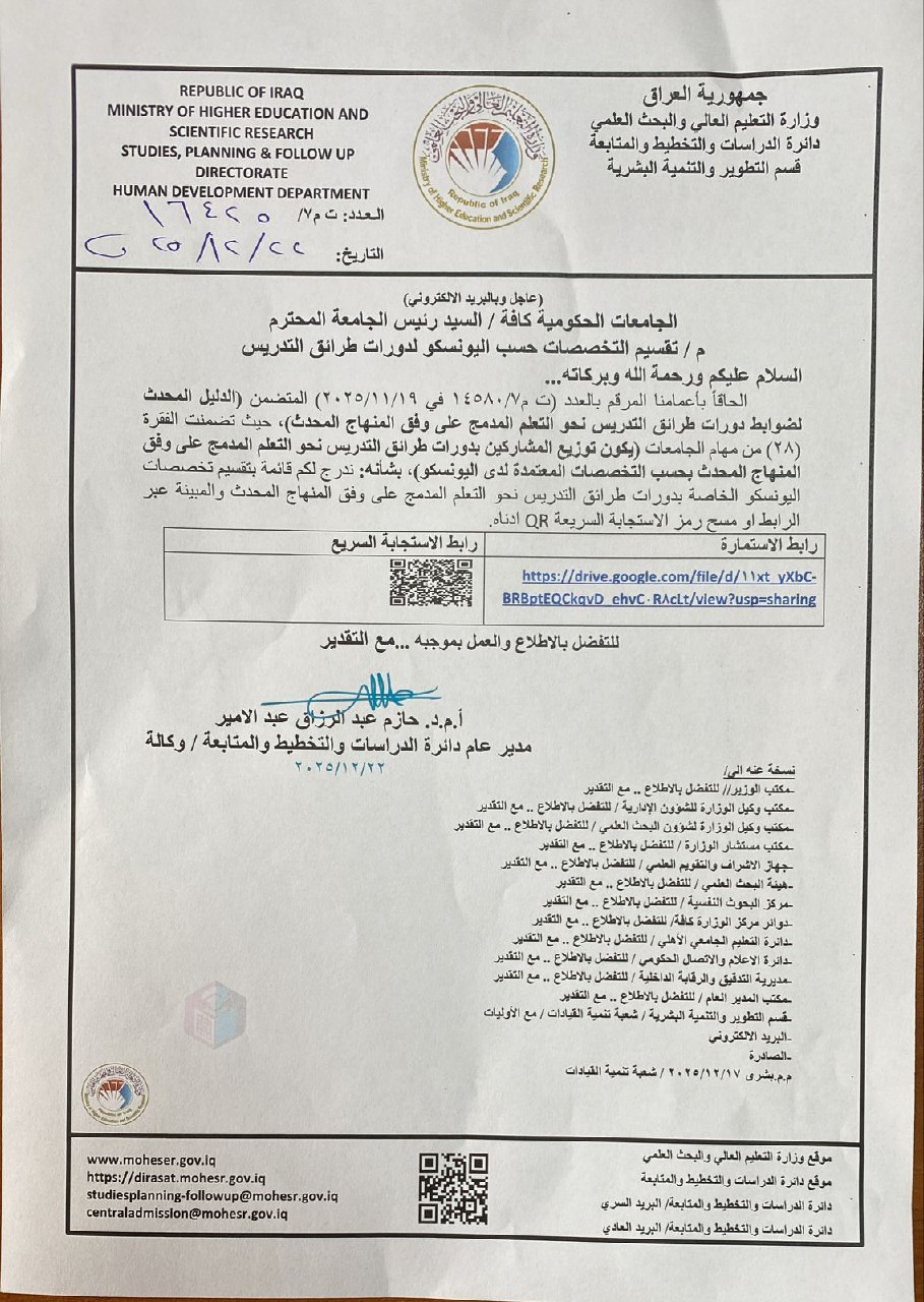 ادناه كتاب وزارة التعليم العالي والبحث العلمي الذي يتضمن تقسيم التخصصات حسب اليونسكو لدورات طرائق التدريس الدليل المحدث لضوابط دورات طرائق التدريس نحو التعلم المدمج على وفق المنهاج المحدث، حيث تضمنت الفقرة (۲۸) من مهام الجامعات يكون توزيع المشاركين بدورات طرائق التدريس نحو التعلم المدمج على وفق المنهاج المحدث بحسب التخصصات المعتمدة لدى اليونسكو)، بشأنه ندرج لكم قائمة بتقسيم تخصصات اليونسكو الخاصة بدورات طرائق التدريس نحو التعلم المدمج على وفق المنهاج المحدث والمبينة عبر الرابط ادناه. رابط